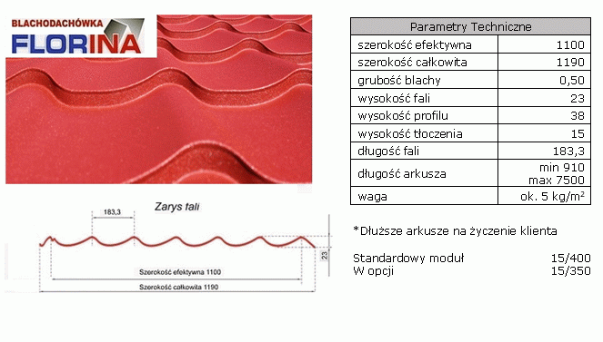 Jest to najnowsza Blachodachówka w ofercie Florian Centrum S.A. Bez wątpienia jest jednym z bardziej ekonomicznych a jednocześnie wysokiej jakości pokryciem dachowym. Wydłużokna linia modułu pozwala znacznie obniżyć koszty wykoknania dachu poprzez zmniejszenie ilości więźby dachowej. Konstrukcja blachodachówki upraszcza montaż i wpływa na obniżenie kosztów. Oferowane powłoki lakierowane, stosowane na blachodachówkach dostępne są w wersji połysków, matów gruboziarnistych oraz powłoką Colocoat Prisma o grubości 50 µm.